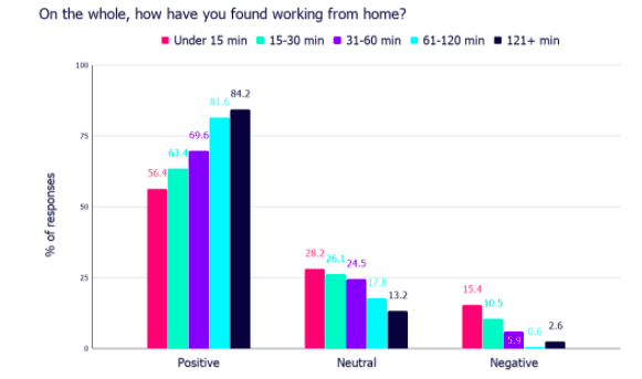 Tương tự, trải nghiệm tiêu cực khi làm việc từ xa là tối thiểu đối với nhân viên sống hơn một giờ từ nơi làm việc, trong khi nó lên đến 15,4% đối với những người sống dưới 15 phút.