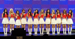 Loona tại showcase ra mắt vào tháng 8 năm 2018. Từ trái sang phải: HyunJin, JinSoul, YeoJin, Chuu, Yves, HeeJin, Kim Lip, Olivia Hye, Go Won, Choerry, ViVi, HaSeul. | |||