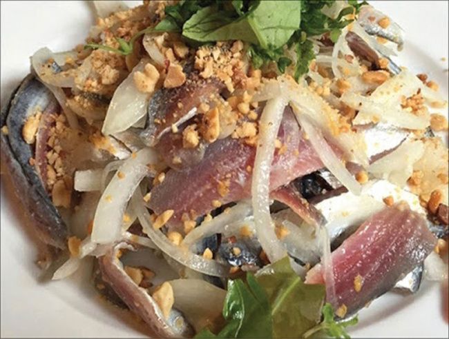 Gỏi cá bỗng kiểu Sông Lô nổi tiếng với việc sử dụng xương cá làm nền thay vì bánh tráng thông thường. Thịt cá được cắt mỏng, cuốn chung với bánh tráng, lá sung, chuối xanh và khế chua, tạo ra sự hoà quyện của 4 hương vị: chua, cay, mặn và ngọt, kết hợp với cảm giác giòn của cá tạo nên một trải nghiệm đặc biệt mà bạn sẽ khó quên.