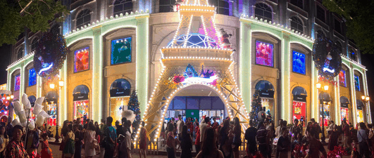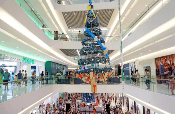 Các khu trung tâm thương mại như Vincom Center, Parkson,… đã trở thành điểm đến quen thuộc với người dân Sài Gòn mỗi khi đến dịp lễ hội. Và dịp Giáng Sinh không ngoại lệ, khi các khu mua sắm rực rỡ với cây thông Noel, hộp quà, và bông tuyết tuyệt đẹp.