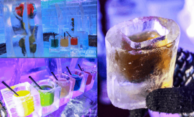 Quán cà phê ấn tượng với thiết kế độc đáo, bàn ghế, đồ uống, thậm chí cả chén đều được làm từ đá băng, mang đến trải nghiệm mới lạ cho những người muốn thưởng thức không khí Giáng Sinh khác biệt, đặc biệt là đôi tình nhân.