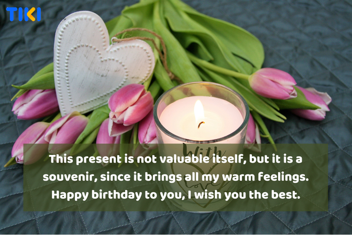 - Món quà này không có giá trị bản thân nó, nhưng nó là một kỷ niệm, vì nó mang đến tất cả những cảm xúc ấm áp của anh. Chúc mừng sinh nhật em, anh mong em có những điều tốt nhất. – This present is not valuable itself, but it is a souvenir, since it brings all my warm feelings. Happy birthday to you, I wish you the best.