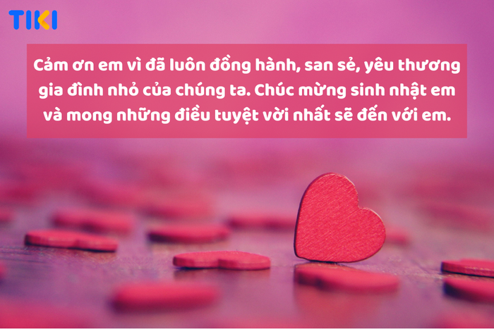 - Đây là điều anh muốn nói từ lâu, cảm ơn em vì đã luôn quan tâm đến từng bữa ăn, giấc ngủ, cái quần cái áo cho cha con anh. Dù đôi lúc anh thấy mình cũng vô tâm, vì bận rộn công việc mà chưa thật sự quan tâm tới gia đình mình, em cũng rộng lượng thông cảm. Cảm ơn em nhiều lắm! Chúc vợ của anh có ngày sinh nhật vui vẻ. Chúc em luôn mạnh khỏe, bình an.
