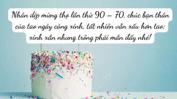 - Chúc mừng sinh nhật bạn tui. Chúc bạn tuổi mới tính tình mát mẻ, lúc nào cũng tươi trẻ, cuộc đời luôn suôn sẻ nhé!