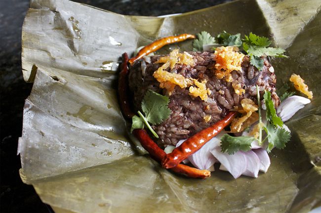 Món ăn này kết hợp thịt heo băm, tiết heo và gạo, sau đó hấp chín, ngâm trong dầu tỏi và được bọc trong lá chuối. Cho dù đối với du khách nước ngoài, món này có vẻ đáng sợ, nhưng không ai có thể phủ nhận hương vị thơm ngon của dầu tỏi. Nếu bạn ghé thăm Paa Jaang, nơi đã có 40 năm chế biến khao kan jin, hãy lưu ý đến thời gian vì nhiều cửa hàng thường hết hàng chỉ sau một giờ mở cửa.