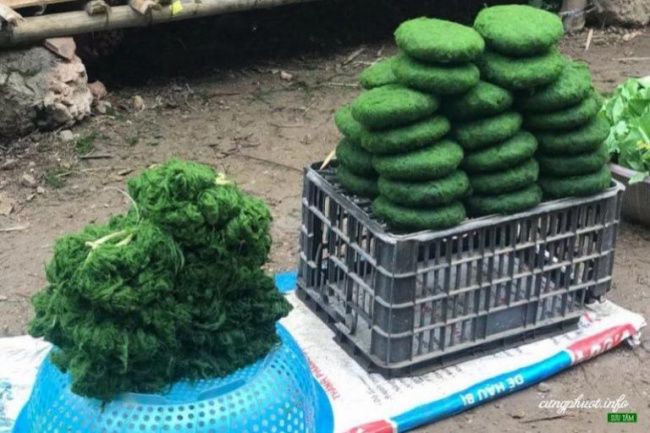 Rêu suối Mường Lò ở Yên Bái được trang trí bằng hạt tiêu rừng, ớt, tỏi, gừng và thịt mỡ, sau đó gói trong lá dong và nướng trên than hoa một cách độc đáo.