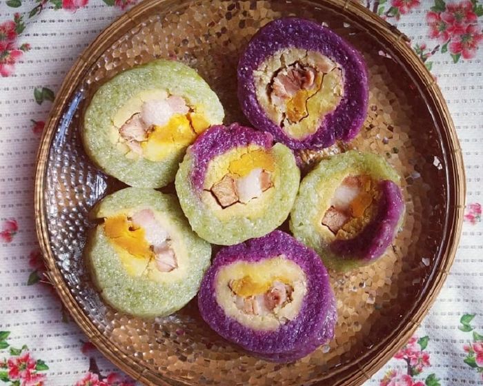 Nhân bánh phong phú với thịt ba chỉ, trứng muối, đậu xanh, tôm khô, tạo nên hương vị độc đáo, lạ miệng. Bánh tét lá cẩm không chỉ ngon mắt mà còn cuốn hút vị ẩm thực đặc trưng của Cần Thơ.