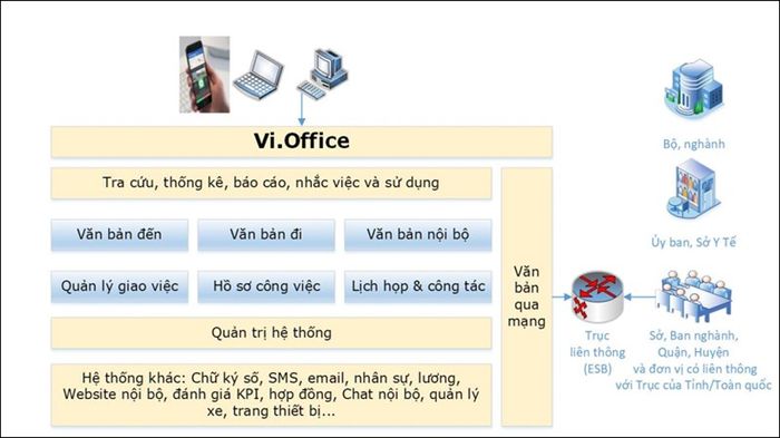 Ngoài ra, Hệ thống Vi.Office tuân thủ đầy đủ các quy chuẩn của hệ thống quản lý thông tin của Chính phủ và có khả năng liên kết với trục liên thông ESB của tỉnh/thành phố.