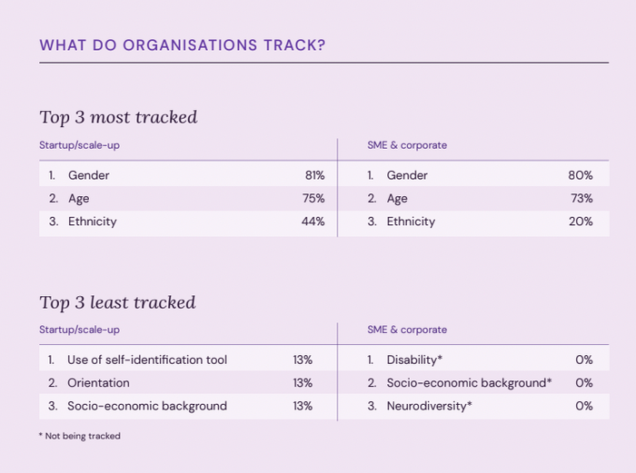 Source: Accelerating greater inclusion and diversity in the tech industryTuy nhiên, Hà Lan, giống như phần lớn châu Âu khác, gặp khó khăn với dữ liệu đa dạng, với giới tính là chỉ mục duy nhất được theo dõi đều đặn bởi các công ty công nghệ. Báo cáo phát hiện rằng 70% các công ty không theo dõi dữ liệu về dân tộc, trong khi khuyết tật, địa vị kinh tế, tình dục và đa dạng thần kinh là các chỉ mục ít (hoặc chưa bao giờ) được theo dõi nhất.