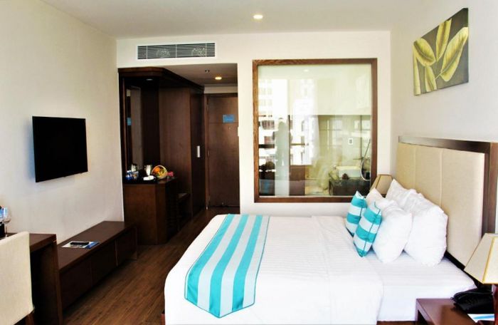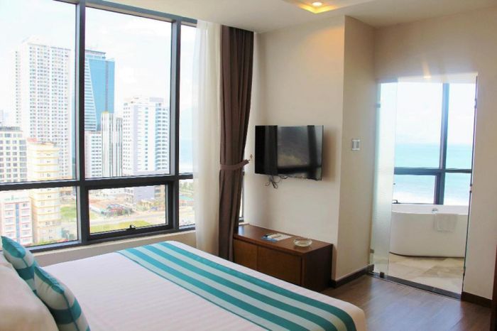 “Nhân viên thân thiện và nhiệt tình. Khách sạn sạch sẽ, chỉ mất 3 phút đi bộ đến bãi biển. Phòng hạng cao nhìn toàn cảnh biển, phòng bình thường chỉ nhìn thấy một phần biển. Điểm trừ là buffet chưa đa dạng.” – Kim