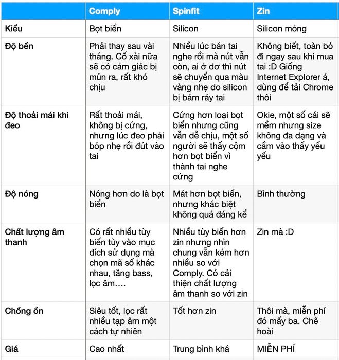 Có hai thương hiệu mà mình luôn ưa chuộng khi nâng cấp nút tai, một là Comply và cái kia là Spinfit. Đây là một tổng quan nhanh chóng cho các bạn xem: