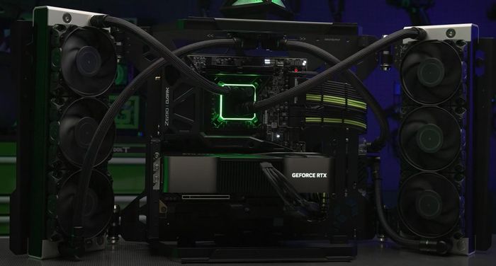 NVIDIA GeForce RTX 4090 Founders Edition có kích thước vô cùng lớn và mạnh mẽ, chiếm đến 3.5 khe PCI. Đặc biệt, với một số sản phẩm như ASUS TUF Gaming, nó còn chiếm nhiều hơn, lên đến 3.65 khe. Về thiết kế bên ngoài, card trông rất giống với thế hệ trước đó - RTX 3090 'Ampere' - nhưng đồng thời cũng to lớn hơn, mang lại sức mạnh của Ada Lovelace và hiệu suất vượt trội chỉ từ cái nhìn đầu tiên. Card yêu cầu nguồn cấp từ một đầu 12VHPWR 16 pin tiêu chuẩn PCIe 5.0.Trong video ngắn chỉ 59 giây, LiquidHaus đã sáng tạo lắp ráp một hệ thống sử dụng linh kiện của EVGA. Điều đặc biệt chính là sự xuất hiện của RTX 4090 Founders Edition, với thiết kế vô cùng ấn tượng và đèn LED rực rỡ. Dưới khối tản nhiệt đồ sộ là con chip với hàng tỉ transistor và 16384 nhân CUDA. Một sản phẩm đáng để chờ đợi từ NVIDIA với giá 1599 USD, sẽ ra mắt vào ngày 12/10 tới.