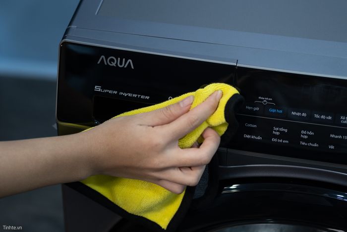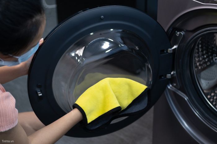 Phần bên ngoài của máy giặt, tôi dùng khăn thấm nước rửa chén lau qua để loại bỏ mọi vết bẩn, keo bám. Sau đó, tôi giặt khăn và lau lại bằng nước sạch. Nếu không quá bẩn, chỉ cần dùng khăn sạch lau qua là máy sẽ trở nên sáng bóng.