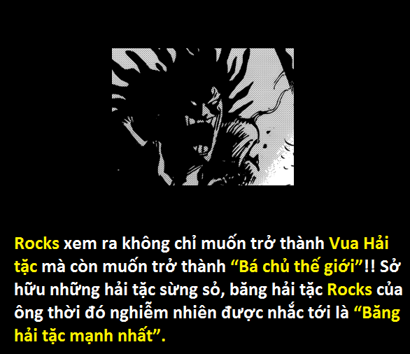 Rocks không chỉ muốn trở thành Vua Hải tặc mà còn muốn trở thành 'Bá chủ thế giới'!! Với những hải tặc mạnh mẽ, băng hải tặc Rocks của ông được xem là 'Băng hải tặc mạnh nhất'.