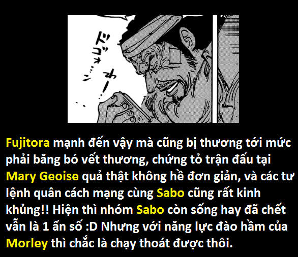 Fujitora mạnh mẽ đến mức bị thương và phải băng bó, chứng tỏ trận đấu tại Mary Geoise thực sự không dễ dàng và các tướng lĩnh cách mạng cùng Sabo đều rất đáng gờm. Hiện tại, liệu nhóm Sabo còn sống hay đã qua đời vẫn là một ẩn số, nhưng với khả năng đào hầm của Morley, họ có thể đã thoát khỏi.