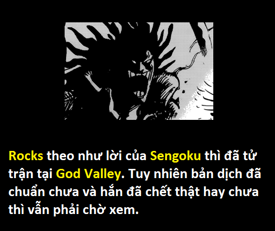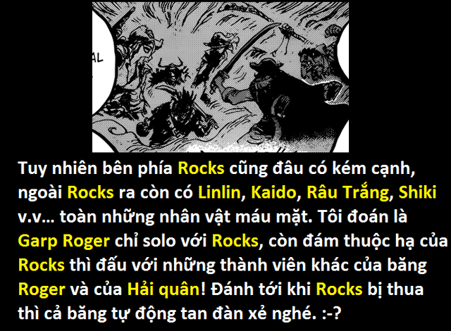 Tuy nhiên, đội hình của Rocks cũng không thua kém, bao gồm Linlin, Kaido, Râu Trắng, Shiki và nhiều nhân vật khác. Tôi dự đoán Garp - Roger chỉ đối đầu với Rocks, còn đám còn lại của Rocks sẽ đối đầu với thành viên khác của băng Roger và Hải quân! Khi Rocks bị đánh bại, cả băng sẽ tan rã.