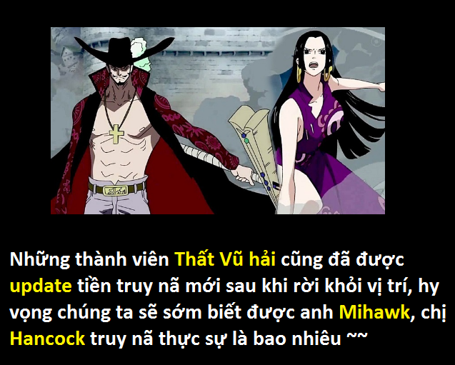 Các thành viên Thất Vũ Hải cũng đã được cập nhật tiền truy nã mới sau khi rời khỏi vị trí, hy vọng chúng ta sẽ sớm biết được mức độ truy nã thực sự của Mihawk và Hancock.