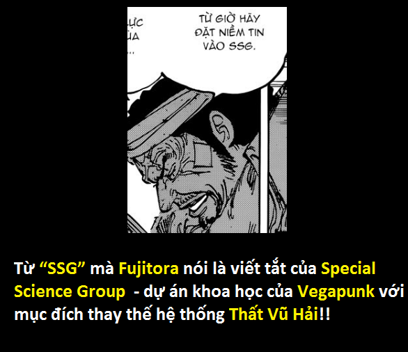 Từ 'SSG' mà Fujitora đề cập là viết tắt của Special Science Group - một dự án khoa học do Vegapunk thực hiện nhằm thay thế hệ thống Thất Vũ Hải!!