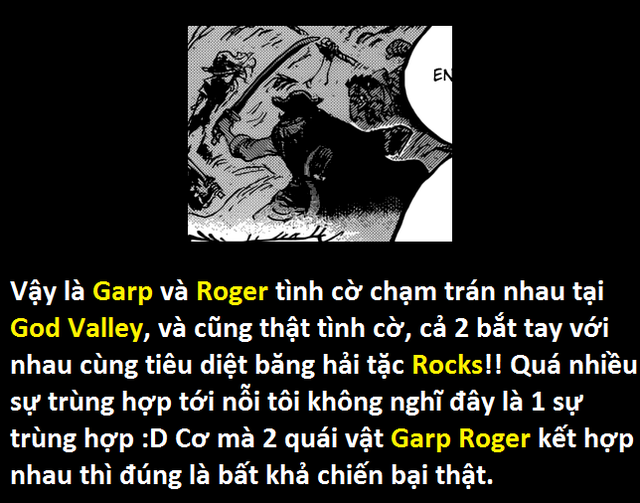 Garp và Roger ngẫu nhiên chạm mặt tại God Valley và kết hợp tiêu diệt băng hải tặc Rocks. Sự trùng hợp quá nhiều đến nỗi tôi nghĩ đó không chỉ là tình cờ. Khi hai quái vật Garp - Roger hợp tác, họ thật sự không thể bị đánh bại.