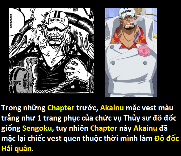 Trong những Chapter trước đó, Akainu mặc vest màu trắng như một biểu tượng của chức vụ Thủy sư Đô đốc, giống như Sengoku, nhưng trong Chapter này, Akainu đã quay trở lại với chiếc vest quen thuộc khi còn là Đô đốc Hải quân.
