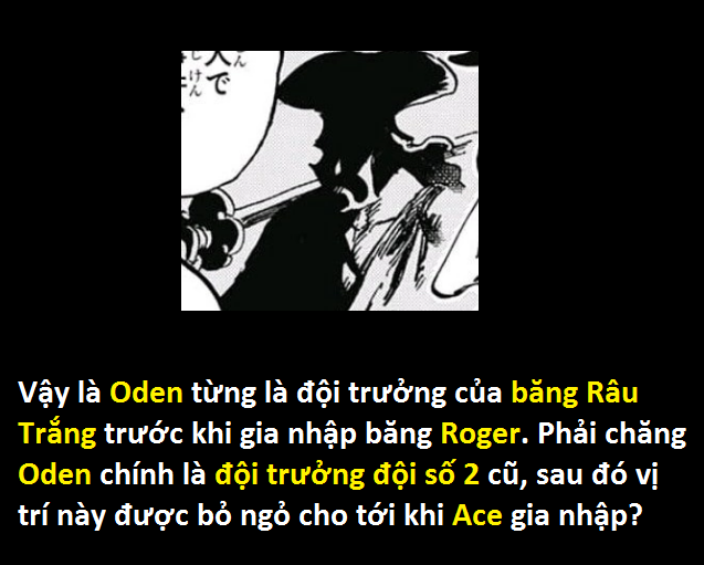 Oden từng là đội trưởng của băng Râu Trắng trước khi gia nhập băng Roger. Có thể Oden là đội trưởng thứ hai, sau đó vị trí này được để trống cho tới khi Ace gia nhập?