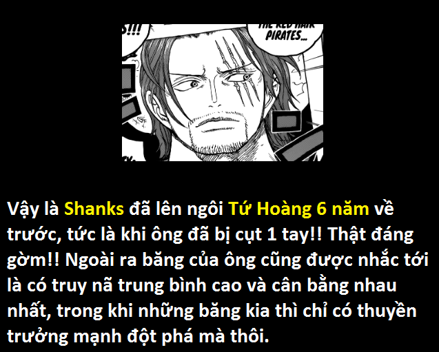Shanks đã trở thành Tứ Hoàng từ 6 năm trước, ngay cả khi ông chỉ còn một tay. Thật ấn tượng! Băng của Shanks được đánh giá là có mức độ truy nã trung bình cao và cân bằng nhất, trong khi những băng khác thì chỉ có thuyền trưởng mạnh mẽ.