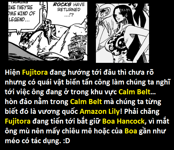 Hiện tại chưa rõ Fujitora đang hướng tới đâu, nhưng với việc có quái vật biển tấn công, có thể ông đang ở trong khu vực Calm Belt. Hòn đảo nằm trong Calm Belt mà chúng ta từng biết đó là vương quốc Amazon Lily! Có lẽ Fujitora đang định bắt giữ Boa Hancock, vì với mắt ông mù, mấy chiêu mê hoặc của Boa gần như không có tác dụng.