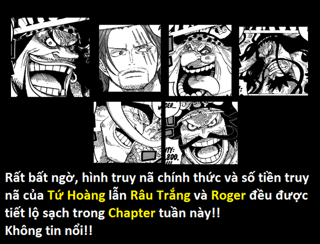 Rất ngạc nhiên, thông tin về hình truy nã và số tiền truy nã của cả Tứ Hoàng lẫn Râu Trắng và Roger đều được tiết lộ trong Chapter tuần này.