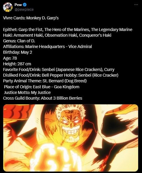 Đó là lý do Vivre Cards trở nên hữu ích, vì chúng giống như các trang thông tin trong một cuốn sách dữ liệu về One Piece. Vivre Card lần này của Garp đã tiết lộ một số thông tin cơ bản, như ngày sinh, tuổi, chiều cao và món ăn yêu thích của ông. Đặc biệt, phần haki xác nhận ông cũng sở hữu Haki bá vương. Mặc dù manga đã thể hiện khả năng này của ông nội Luffy, nhưng việc xác định nó thường rất khó nếu không có các đòn tấn công được mô tả. Đồng thời, nó cũng tiết lộ rằng công lý của Garp là công lý của chính ông.