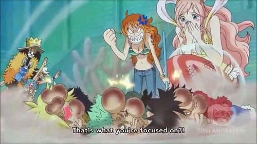 Luffy tiến đến với chiếc Mũ Rơm 'thần thánh' và đội lên đầu Nami, như thể anh đang mang đến cho Nami một ly mì, khiến cô cảm thấy cuộc sống trở nên tươi đẹp trở lại.