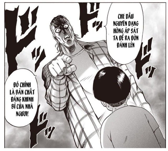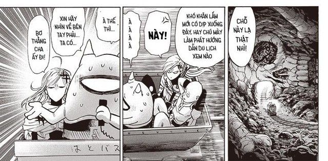 Và không thể quên anh trọc Saitama, dù cuộc chiến căng thẳng nhưng anh ta vẫn dạo chơi thoải mái trong hang ổ của Tổ Chức Quái Vật như là đang đi du lịch. Hy vọng rằng anh ta sẽ không xuất hiện trong chap sau để độc giả có thể chứng kiến trận đấu giữa Vua Quái Vật Orochi và Tatsumaki mà không bị gián đoạn, thay vào đó chỉ là một đấm bốc hơi tiếc nuối vô cùng.