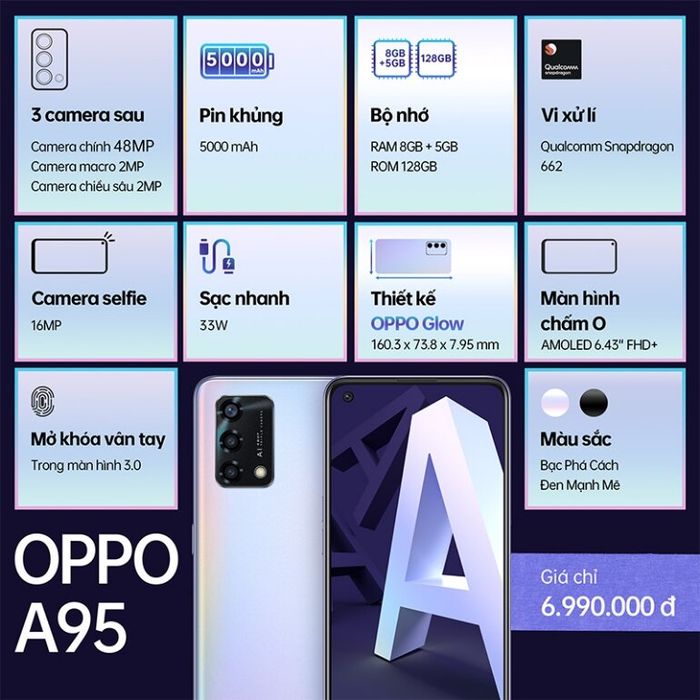 OPPO A95 được niêm yết tại thị trường Việt Nam với giá 6.990.000 đồng, phù hợp với thu nhập bình quân và đáp ứng mong đợi của người dùng.