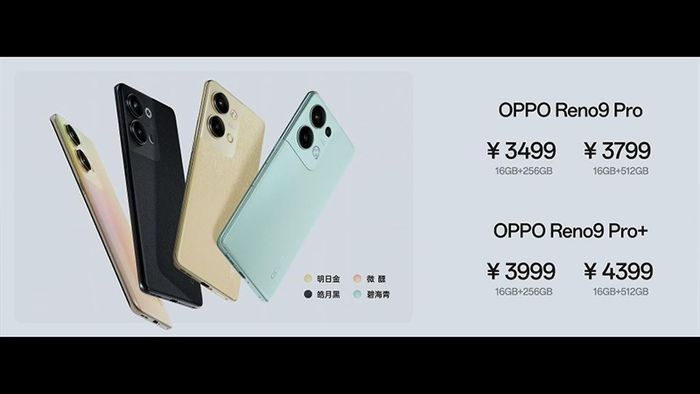 (*)Lưu ý: OPPO Reno9 Pro đã chính thức ra mắt tại thị trường Trung Quốc với mức giá khởi điểm từ 3.499 Nhân Dân Tệ (tương đương khoảng 12.1 triệu đồng) cho phiên bản RAM 16 GB, bộ nhớ trong 256 GB.