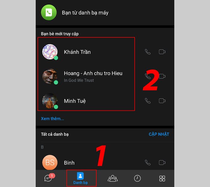 Quay Lại Trang Đầu Tiên, Truy Cập Tab Danh Bạ > Chú Ý Mục Bạn Bè Mới Truy Cập, Tài Khoản Có Chấm Xanh Là Tài Khoản Đang Online.