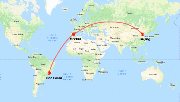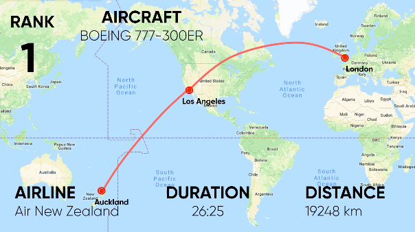 Ngoài ra, các loại máy bay hiện đại thường không có tầm bay đủ để bay thẳng đến tất cả điểm đến từ một điểm. Do đó, các chuyến bay này sẽ cần có một điểm dừng. Chuyến bay thẳng dài nhất với một điểm dừng là từ London đến Auckland thông qua Los Angeles của Air New Zealand. Tiếp theo là chuyến bay từ Bắc Kinh đến Sao Paulo của Air China với một điểm dừng ở Madrid, Tây Ban Nha, và chuyến bay từ London đến Sydney của Qantas và British Airways với điểm dừng ở Singapore.