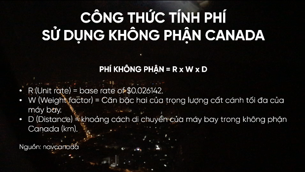 Tương phản với Mỹ, ở nước láng giềng Canada, chi phí được tính bằng một công thức riêng, trong đó phí sử dụng không phận được tính bằng căn bậc hai của trọng lượng cất cánh tối đa nhân khoảng cách di chuyển của máy bay trong không phận, và nhân với hệ số là 0.026142.