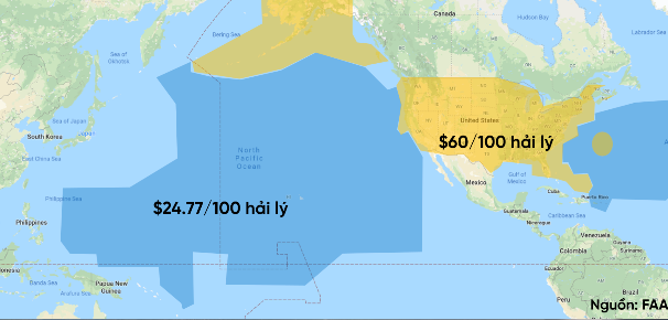 Các nước đã ký hiệp định được phép tính phí sử dụng không phận với các hãng hàng không nước ngoài. Ví dụ, FAA tính phí sử dụng không phận Mỹ là $60 cho mỗi 100 hải lý hoặc 190km kể từ khi máy bay bay vào khu vực đất liền Mỹ kiểm soát. Ngoài ra, một mức phí thấp hơn là $24.77 cho mỗi 100 hải lý hoặc 190km sẽ được áp dụng khi máy bay bay qua vùng biển quốc tế nằm trong không phận Mỹ, những nơi này bao gồm một phần của Đại Tây Dương và Bắc Băng Dương, cũng như là phần lớn Bắc Thái Bình Dương.