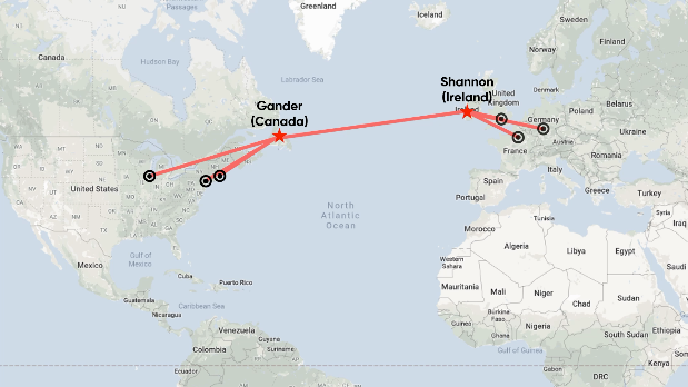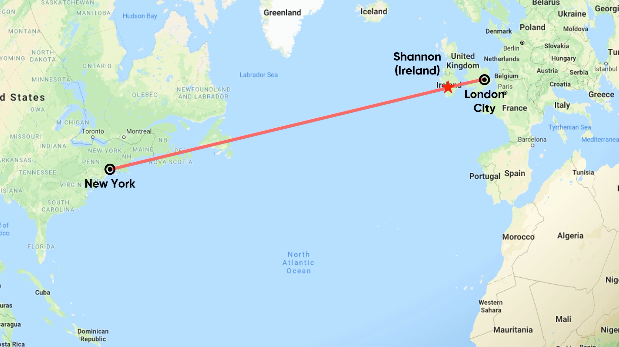 Gander (Canada) và Shannon (Ireland) là hai điểm trung chuyển hàng không quan trọng khi máy bay trước đây có tầm bay ngắn.Ngày nay, với khả năng bay thẳng giữa hai châu lục, Shannon là điểm dừng tiếp nhiên liệu cho chuyến bay BA1 của British Airways từ sân bay London City đi New York. Máy bay sử dụng cho chuyến bay này là Airbus A318 với 32 ghế hạng thương gia có thể ngả phẳng 180 độ, được bố trí theo cấu hình 2-2. Đây cũng là chuyến bay Airbus A318 dài nhất trên thế giới. Hành khách trên chuyến bay này sẽ làm thủ tục hải quan tại Shannon, sau đó xuống máy bay ở nhà ga nội địa tại sân bay JFK của New York.