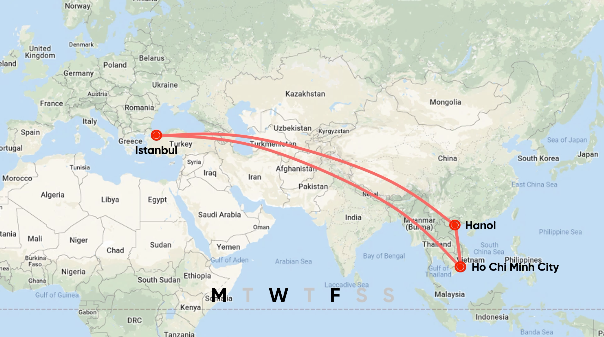 Trước khi có các chuyến bay thẳng tới Hà Nội và Tp.HCM, Turkish Airlines đã có một lịch trình bay độc đáo tới Việt Nam. Vào các ngày thứ 2, thứ 4 và thứ 6, hãng bay từ Istanbul tới Hà Nội, sau đó tiếp tục đi Tp.HCM trước khi quay về Istanbul. Vào các ngày thứ 3, thứ 5, thứ 7 và Chủ nhật, hãng bay từ Istanbul tới Tp.HCM, sau đó tiếp tục đi Hà Nội trước khi quay về Istanbul. Tuy nhiên, Turkish Airlines không có thương quyền 8 để vận chuyển hành khách giữa Hà Nội và Tp.HCM, do đó duy nhất cách để bay chặng này là phải kết thúc ở Thổ Nhĩ Kỳ.