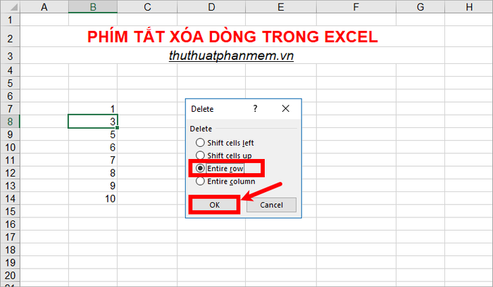 Chú ý: Muốn xóa dòng đang hiển thị (dòng chứa ô bạn đang nhìn) thì khi ấn Ctrl + -, hộp thoại hiện ra, chọn Entire row, rồi bấm OK.