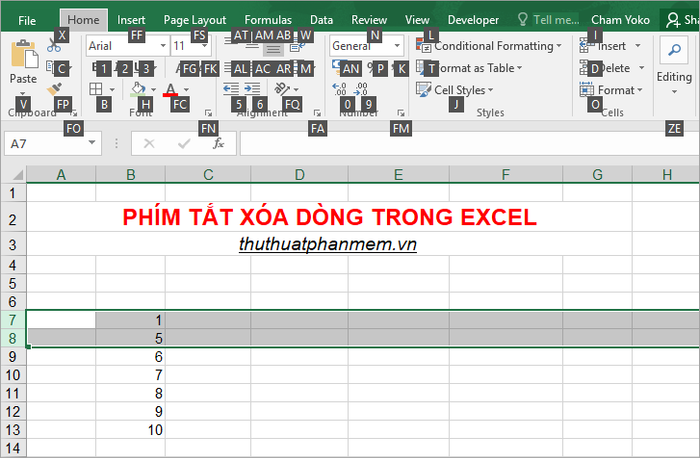 Chọn phím D, sau đó đặt lược đồ lên phím R. Kết quả là tổ hợp phím tắt Alt + H -> D -> R, nghĩa là bạn lựa chọn Home -> Delete -> Delete Sheet Rows.