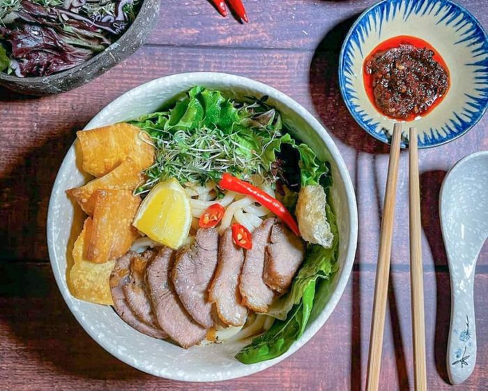 Nâng cao trải nghiệm ẩm thực bằng cách thêm đậu phộng, hành lá thái, rau thơm, và ớt đỏ cay khi thưởng thức Mì Quảng tại những quán ăn độc đáo ở khu du lịch phố cổ Hội An.