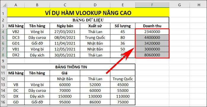 Tính doanh thu trong bảng dữ liệu sau bằng cách sử dụng hàm VLOOKUP.