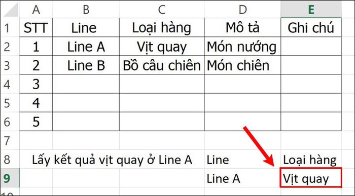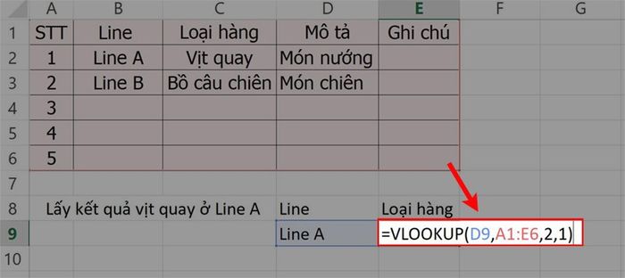 Bước 1: Nhập công thức =VLOOKUP(D9,A1:E6,2,1) vào ô mà bạn muốn hiển thị kết quả.