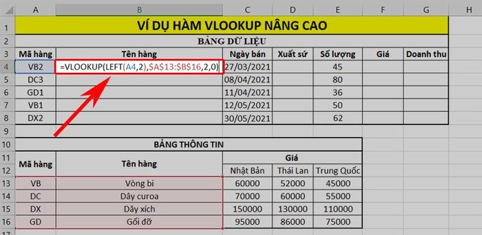 Bước 1: Trong bảng tính Excel, nhập công thức =VLOOKUP(LEFT(A4,2),$A$13:$B$16,2,0) vào ô mà bạn muốn hiển thị tên hàng.