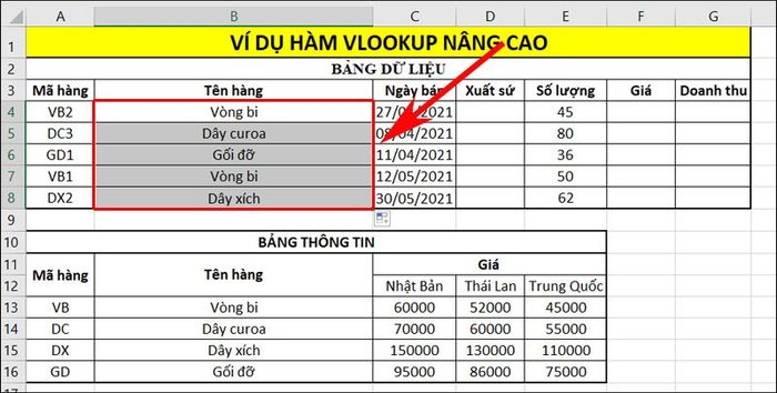 Dùng hàm VLOOKUP để nhập tên hàng dựa trên mã hàng trong bảng thông tin dưới đây.