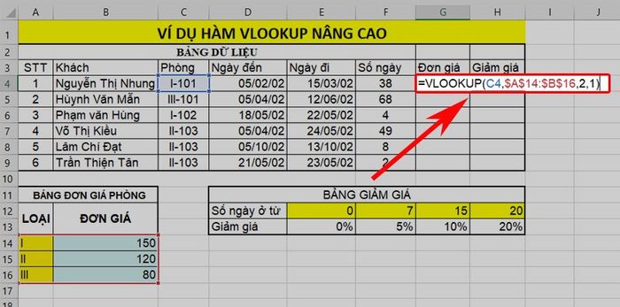 Bước 1: Trên bảng tính Excel, nhập =VLOOKUP(C4,$A$14:$B$16,2,1) vào ô tham chiếu đơn giá.