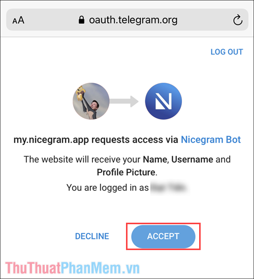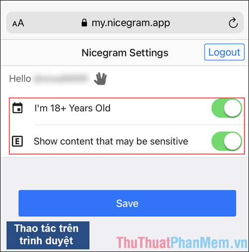 Sau khi xác nhận trên Telegram, mở lại Safari và Nicegram lúc này đã chuyển đến trang cài đặt.