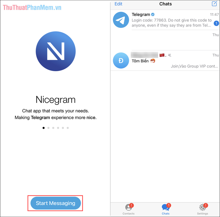 Bước 2: Ở giao diện chính của Nicegram, hãy chọn Bắt đầu Nhắn tin để bắt đầu và đăng nhập bằng tài khoản Telegram của bạn trên điện thoại.