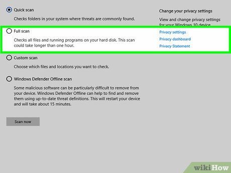 Chắc chắn ô 'Quét đầy đủ' đã được đánh dấu. Ô này nằm ở đầu trang. Chế độ quét đầy đủ sẽ diệt sạch virus trong máy tính, nhưng lưu ý rằng Windows Defender sẽ mất hơn một giờ để quét toàn bộ.